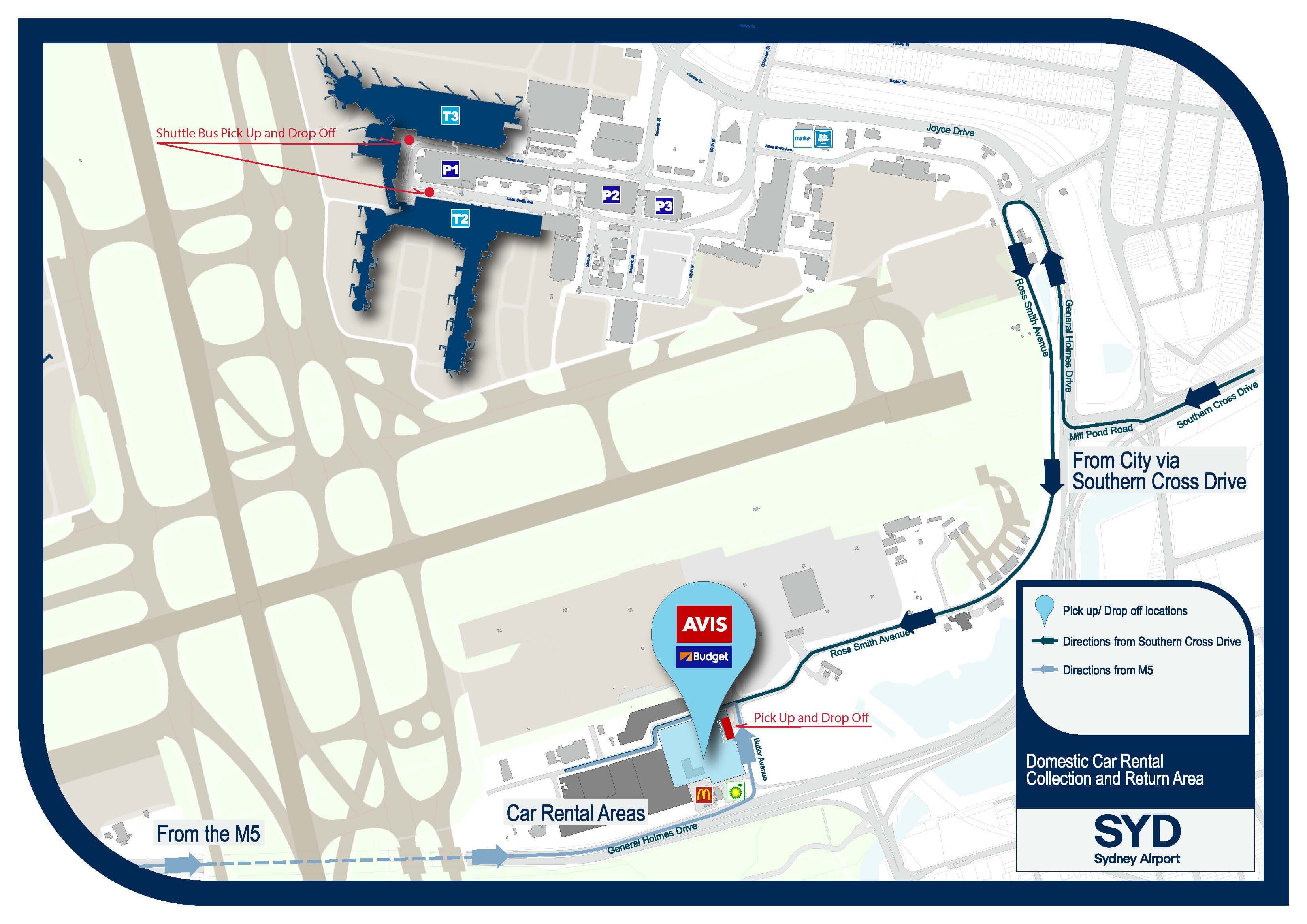 - To allow enough time to shuttle to or from the Avis car rental pick up point and the domestic terminals, Sydney Airport is advising all customers to allow for an additional 30 minutes or more transit time.